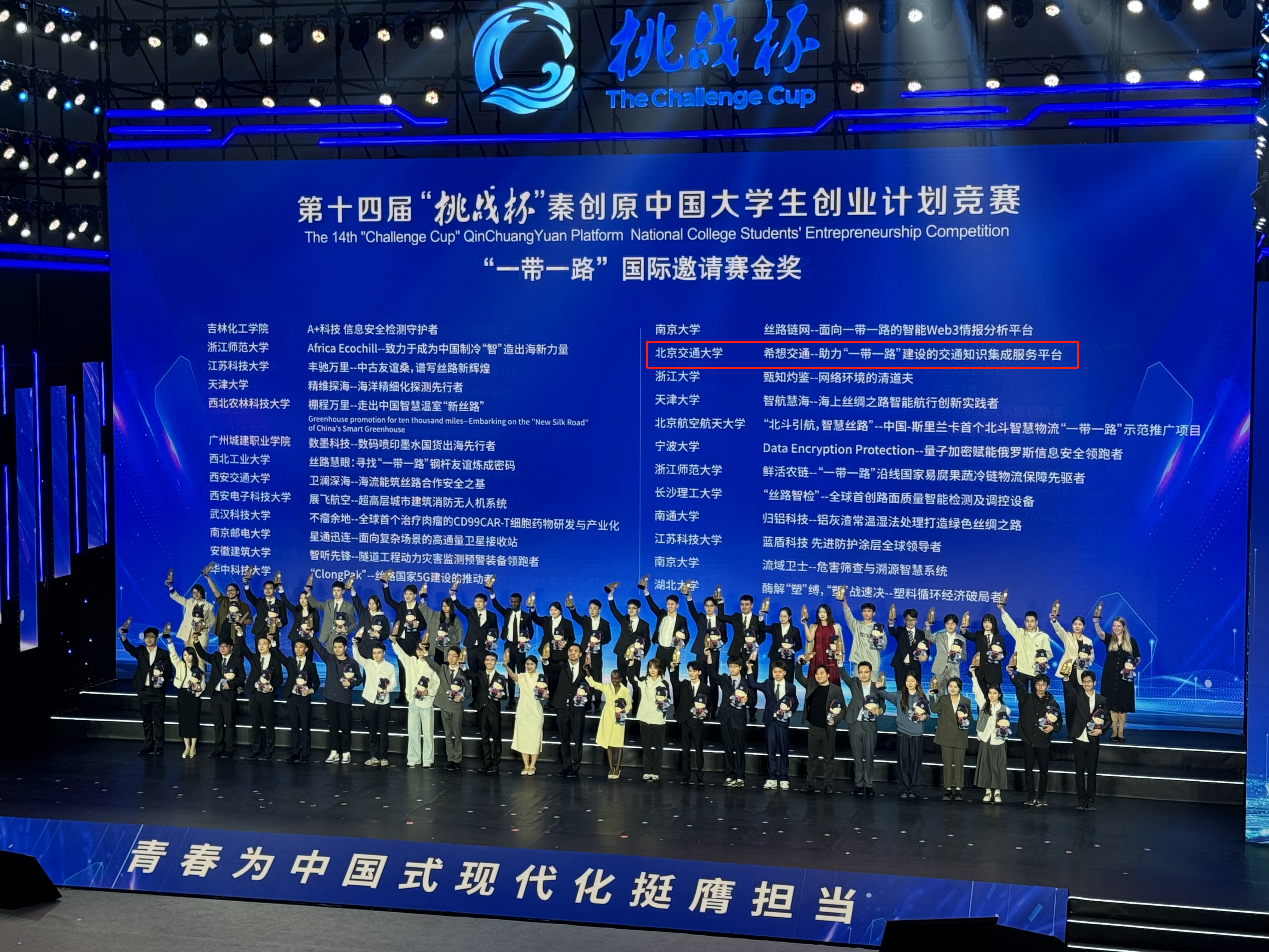 在11月2日于西安交通大学(兴庆校区)落幕的第十四届“挑战杯”秦创原中国大学生创业计划竞赛中,jdb电子试玩 师生参赛的项目“希想交通——助力‘一带一路’建设的交通知识集成服务平台” 经过校赛、市赛的层层选拔,最终获得“一带一路”国际邀请赛国赛金奖!实现校院两级历史最好成绩新突破!