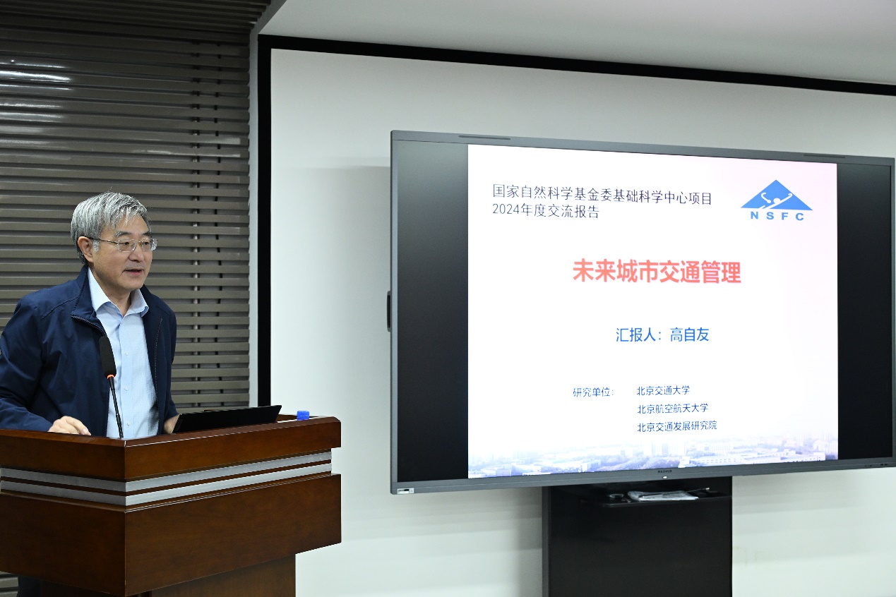项目负责人高自友教授现场汇报了“未来城市交通管理”基础科学中心项目的工作进展。他指出,中心项目组围绕2023-2024年度既定工作计划,扎实推进各项研究工作,不仅在学术高地、人才高地和智库高地建设等核心目标和任务方面取得了重要成果,也为我国城市交通的未来发展与实际应用提供了坚实的科学与技术支撑,有力助推了相关领域的理论研究与实践探索。